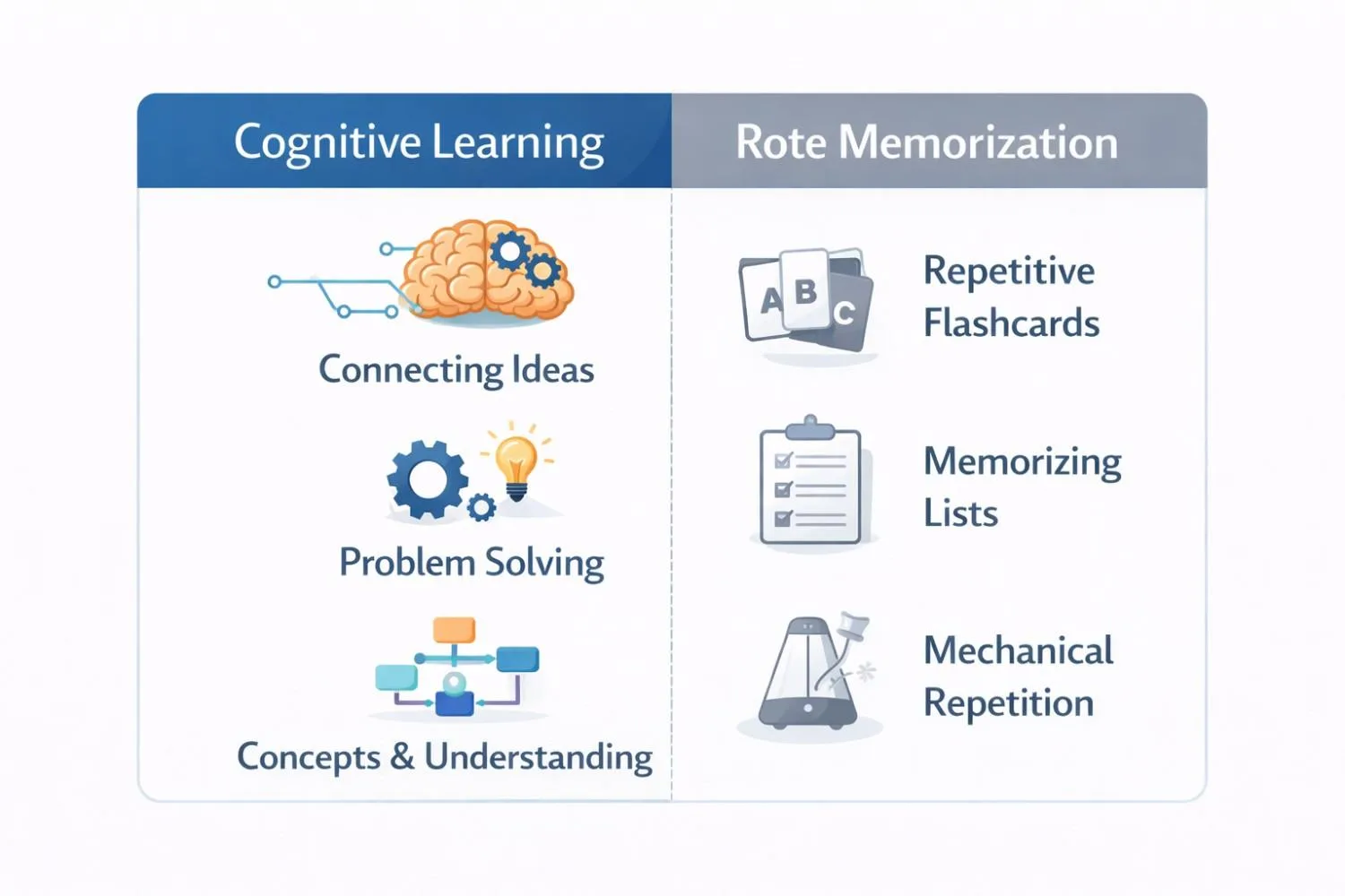 Unlike rote memorization where facts are repeated until retained, cognitive learning emphasizes comprehension and the ability to apply knowledge in new situations. This approach matters in both traditional education and modern workplace training because it produces learners who can reason through unfamiliar problems rather than just recall predetermined answers.